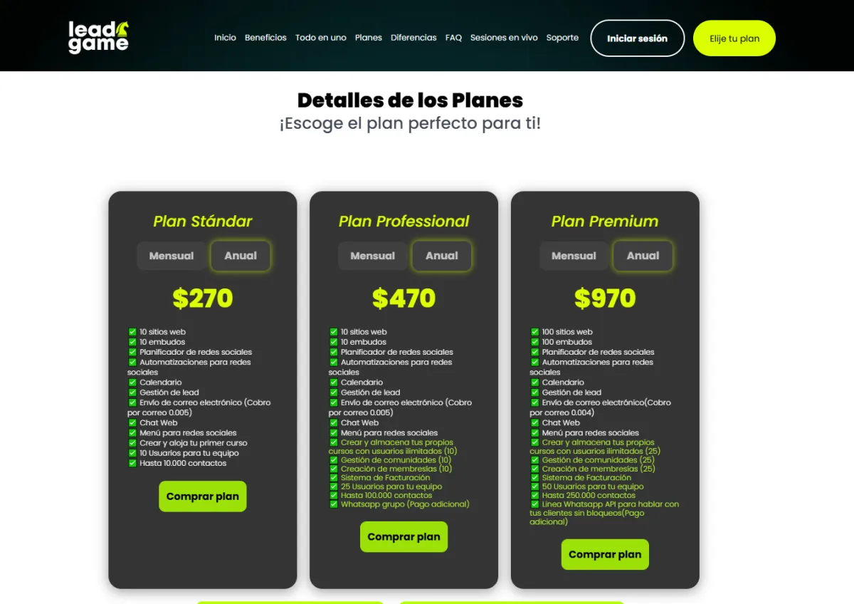Estos son los costos y servicios si pagas directamente en la pagina oficial de lead game.